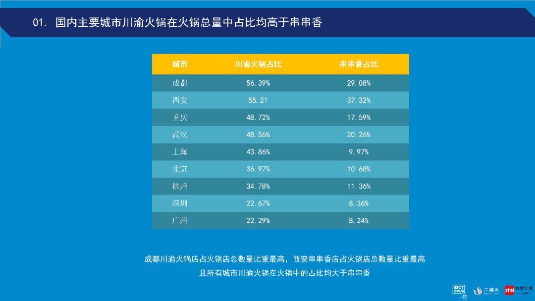 火锅品类已经占据国内餐饮行业半壁江山,而川渝火锅(含串串)又占据火锅品类的最大份额。全国9大城市中,「成都、重庆川渝火锅店数量占到了整个火锅品类数量的85.47%和92.53%,几乎独占市场」。