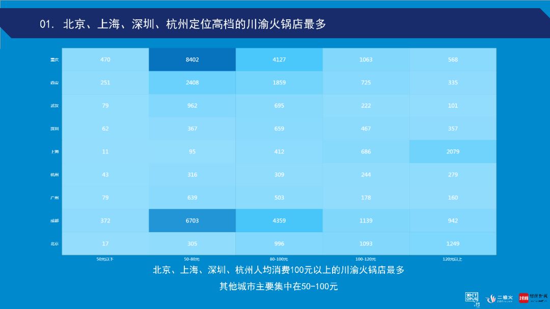 客单价100元以上店数量合计占比超过了35%,相对占比也不小。满足品质社交的细分市场需求不容忽视,在50-80元主流竞争市场以外,我们应该可以对川渝火锅有更大的想象力。「客单价在100元以上,定位于品质人群商务宴请、家庭和朋友聚会的川渝火锅,是一个值得研究的细分市场」。